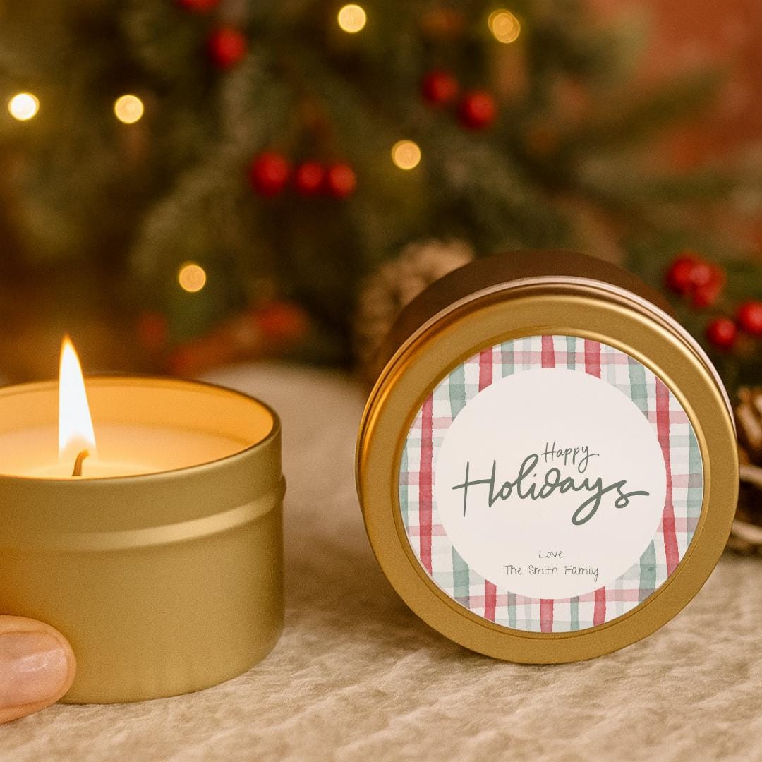 • Finish: Gold metal tins with personalized red + green plaid holiday labels