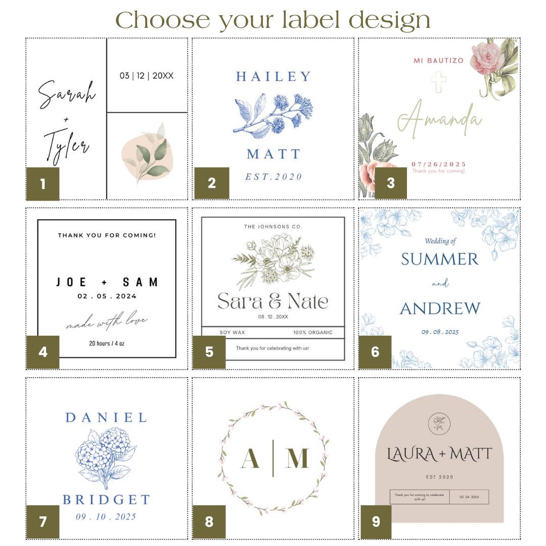 Customize your label, flower design & candle scent to add a warm, personal touch to your special day – handcrafted with love and designed to be keepsake-worthy gifts for your guests.