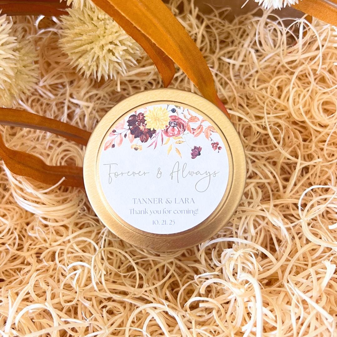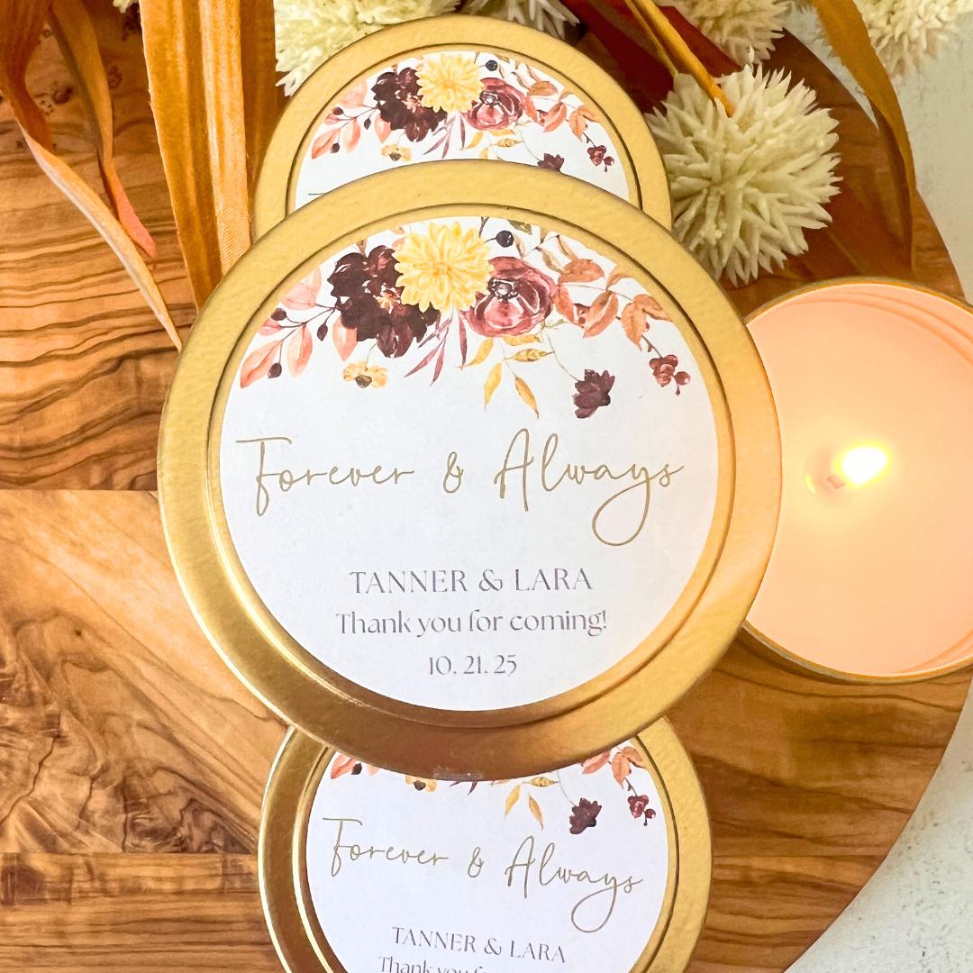 Our autumn theme "Forever & Always" soy wax candle favors are the perfect personalized guest gifts for any occasion! Customize your label & candle scent to add a warm, personal touch to your special day – handcrafted with love and designed to be keepsake-worthy gifts for your guests.
