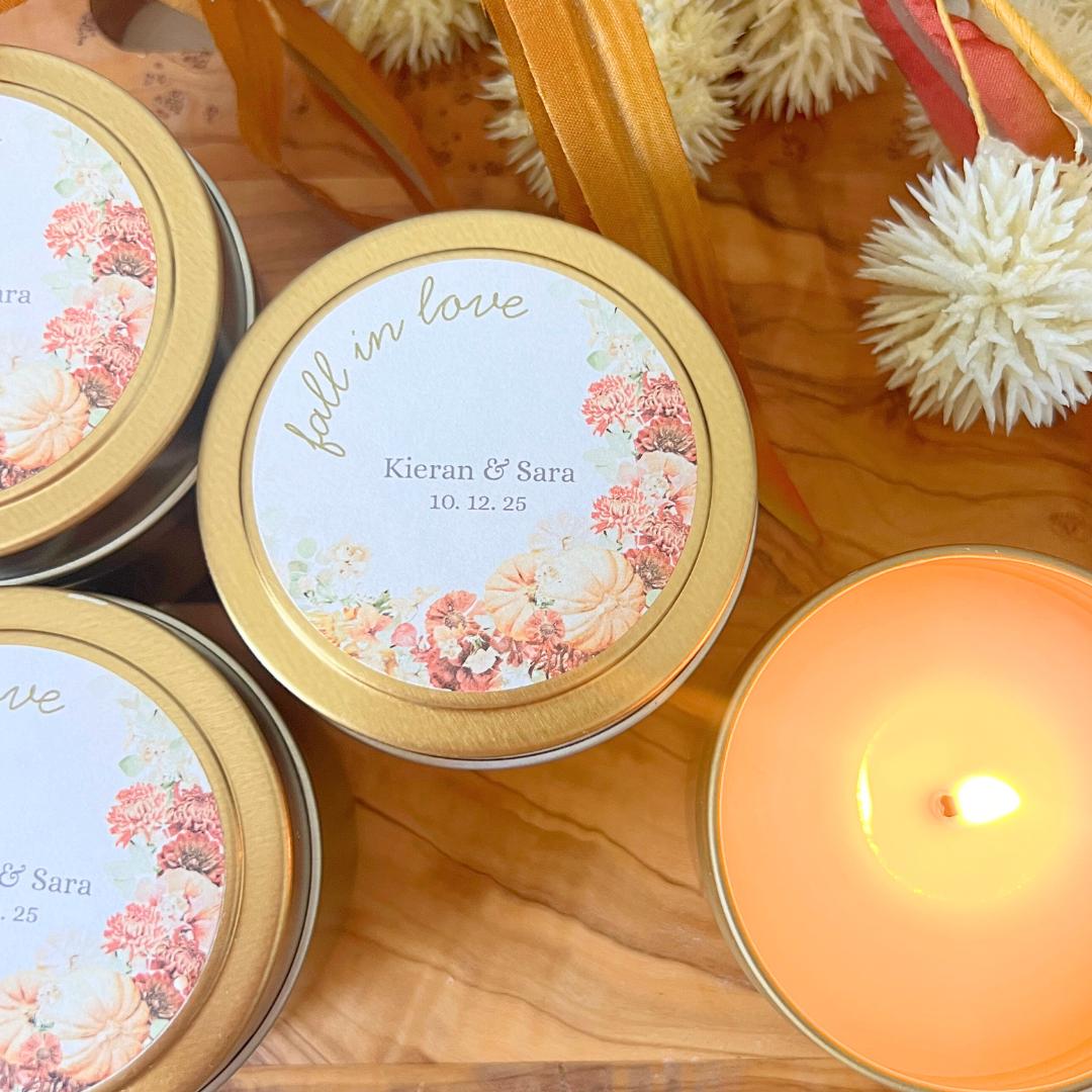 Celebrate your fall wedding with our "Fall In Love" soy wax candle favors. They are the perfect personalized guest gifts for any occasion! Customize your label & candle scent to add a warm, personal touch to your special day – handcrafted with love and designed to be keepsake-worthy gifts for your guests.
