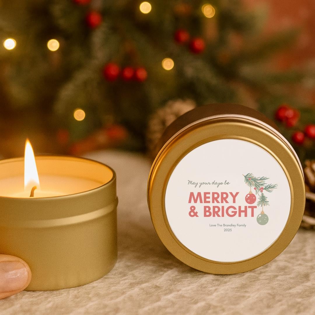 Our bulk gold tin candles with personalized Merry & Bright labels are the perfect touch for your holiday celebrations. Whether you’re planning a family Christmas party, a winter wedding, or a festive office gathering, these custom candle favors add warmth and charm to every table.