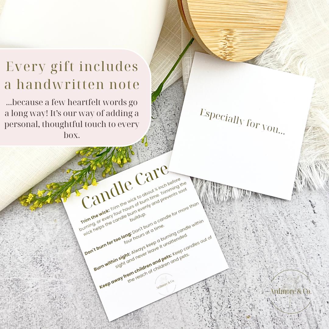 Each candle comes tucked inside our signature white branded box and includes a handwritten note & candle care for a personal touch. It’s the kind of thank-you they’ll actually use—and remember.