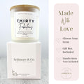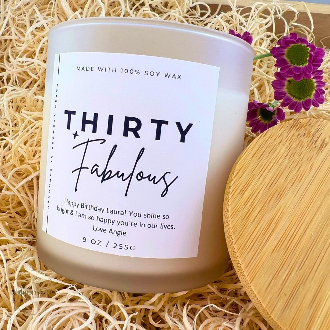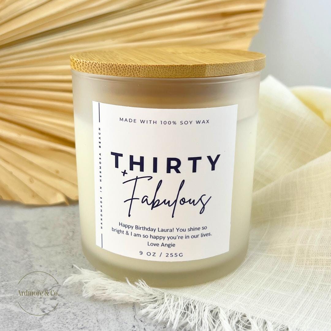 This custom candle makes the perfect gift! Designed to celebrate your friends 30th birthday, each candle is customized with a short birthday message, scent of choice, and handwritten card.