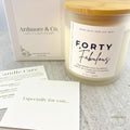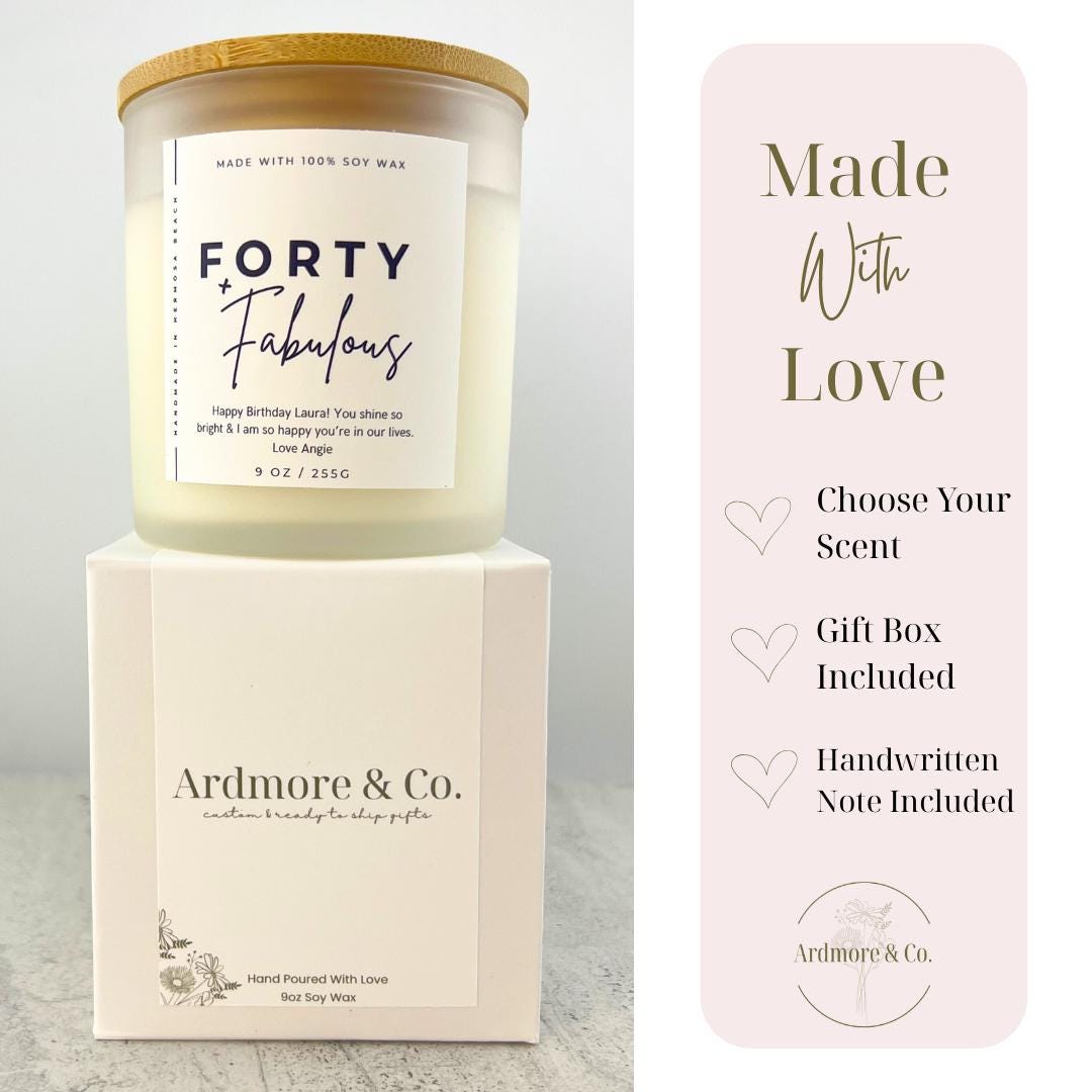 This custom candle makes the perfect gift! Designed to celebrate your friends 40th birthday, each candle is customized with a short birthday message, scent of choice, and handwritten card.