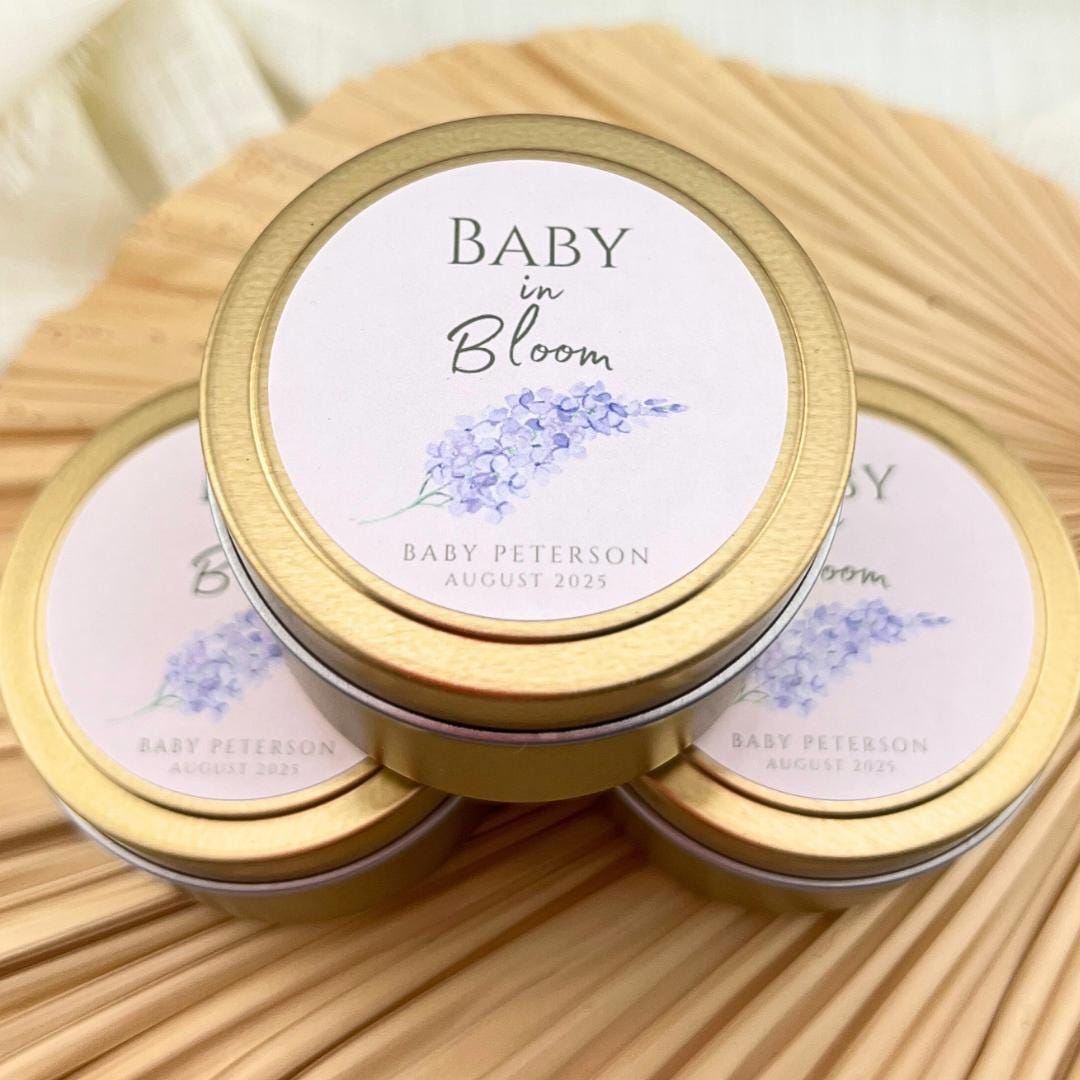 Our 'Baby in Bloom' baby shower candle favors are the perfect personalized guest favors! Customize your label & candle scent to add a warm, personal touch to your special day – handcrafted with love and designed to be keepsake-worthy gifts for your guests.