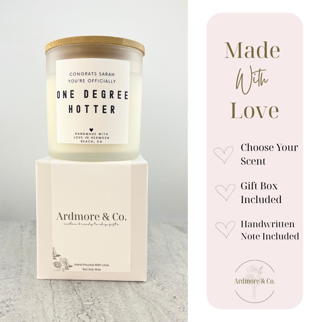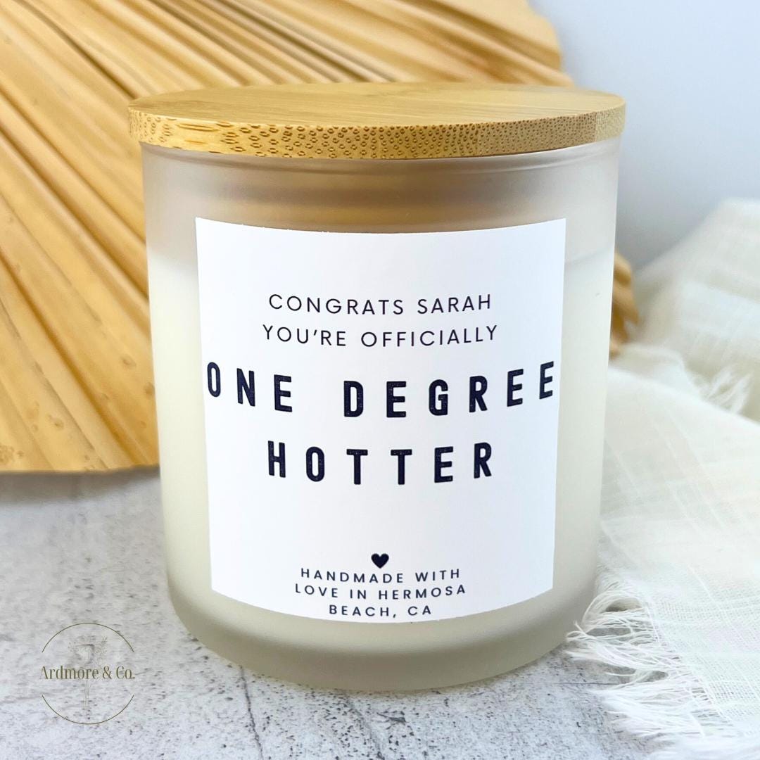 This custom candle makes the perfect grad gift, or way to personalize a congrats for someone special in your life! Designed to celebrate a special accomplishment, each candle is customized with a name, short message, and handwritten note.