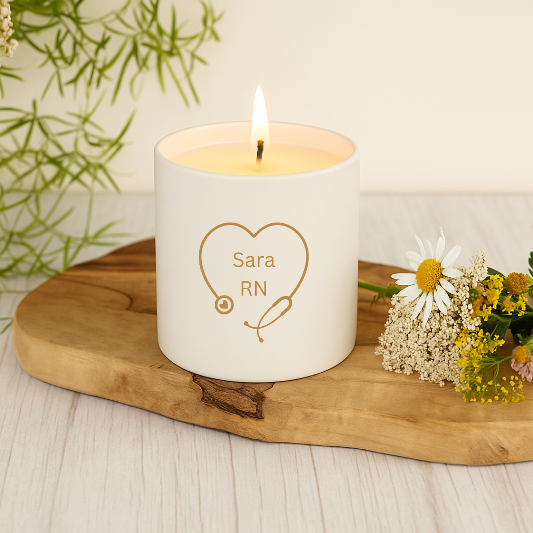 Celebrate a remarkable achievement with our custom healthcare candle, thoughtfully designed for graduating doctors, nurses, and healthcare heroes. Each candle is personalized with your chosen name and designation & features a modern line-drawn stethoscope illustration — a meaningful gift that honors years of hard work, compassion, and dedication.