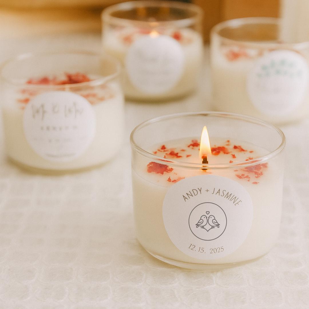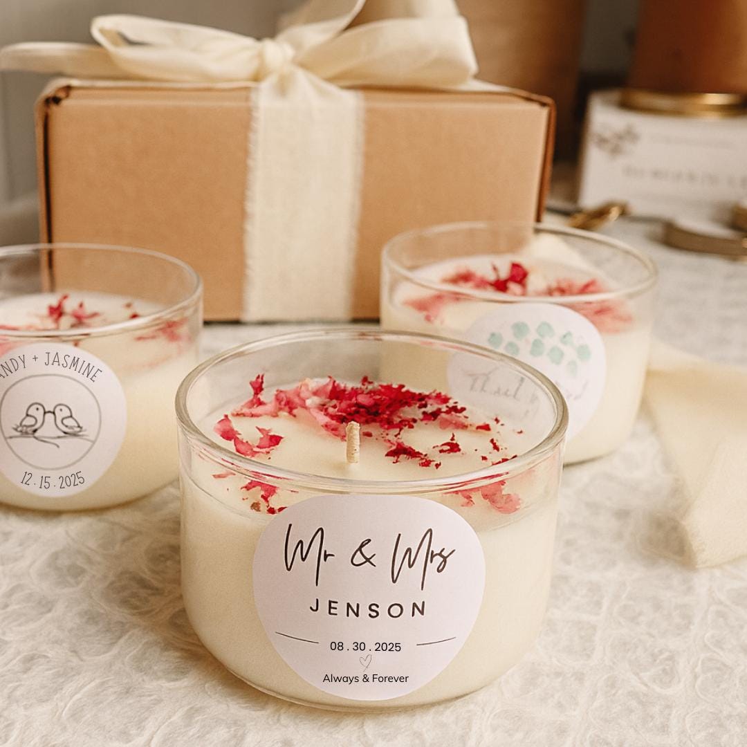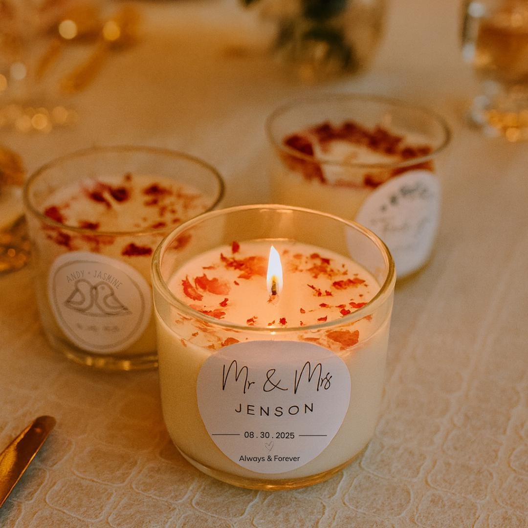Topped with delicate rose petals, these candles double as beautiful flower wedding decor and heartfelt thank-you gifts. Designed with a custom label personalized with your names, wedding date, or special message, they create a keepsake your guests will treasure long after your big day.