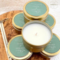 These 2oz or 4oz mini candles are handmade in Hermosa Beach , California with 100% natural soy wax, clean-burning eco wicks, and delicately scented with a clean fragrance – subtle, elegant, and perfect for a any celebration. Hand poured into gold tins, each candle is beautifully designed and customized label.