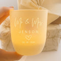 Each tealight holder is carefully engraved in our Hermosa Beach, California studio. The design is etched into the soft white exterior of the glass, allowing the candlelight to shine through with a warm, glowing finish — a stunning detail for personalized wedding table décor, engraved couple candle favors, or custom wedding keepsake gifts.
